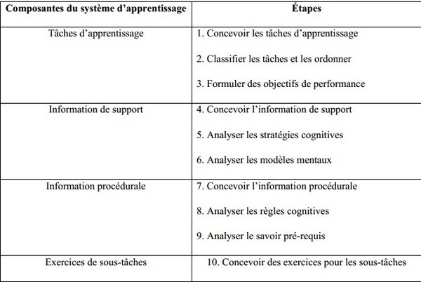 Tableau 1. Composantes du modèle de contenu de la formation 4C/ID et les étapes de conception de chaque composante (tableau adapté de Kirschner et van Merriënboer, 2008)