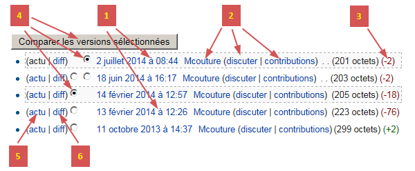 - Un lien actu, devant chaque version, pour afficher les différences entre cette version et la version actuelle de la page;