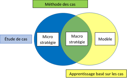 - sur l’axe vertical : le type de stratégie : microstratégie (comprenant « étude de cas » et « résolution de problème », la méthode des cas évoluant entre la micro et la macrostratégie, puis les types macrostratégie et modèle (couverts tous deux par l’ABC et l’APP, qui peuvent être l’une ou l’autre, tel que justifié plus haut).