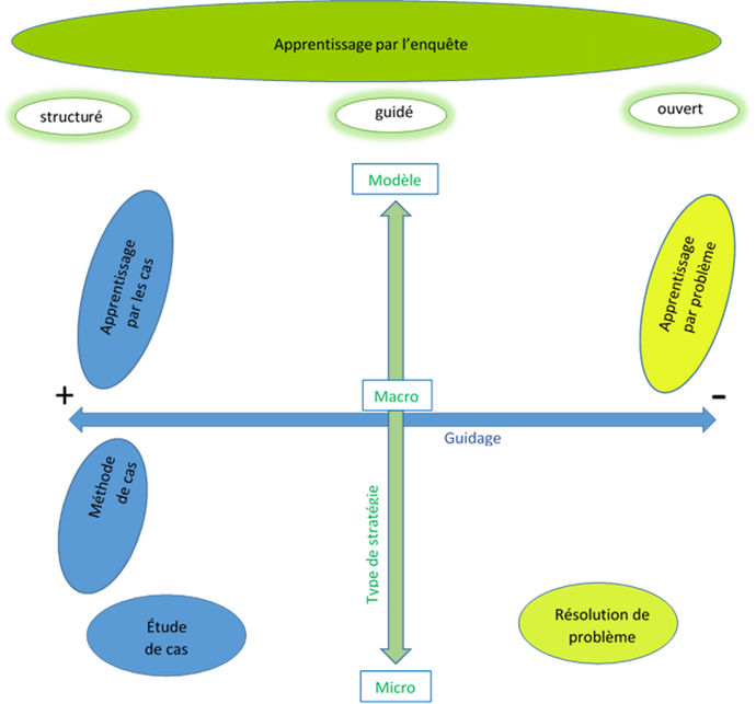- sur l’axe horizontal : le degré de guidage des apprenants (à gauche l’apprentissage basé sur les cas, dans lequel le guidage est plus présent et serré ; à droite l’apprentissage par problème, dans lequel le guidage concerne essentiellement le niveau métacognitif);