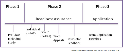 La stratégie se déroule en trois phases : la préparation avant-classe, le test d’assurance de mise à niveau, l’activité d’application en équipe (Haidet et al., 2012) :