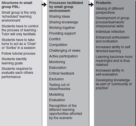 Habituellement, l’apprentissage selon l'APP se déroule en petits groupes (entre 5 et 10 membres) (Newman, 2005). Certains chercheurs affirment que de petits groupes peuvent faciliter l’apprentissage en créant un environnement d’apprentissage favorable qui soutient le développement cognitif et métacognitif (Benson, Noesgaard, Drummond-Young, 2001, cité dans Newman, 2005). Voici le tableau qui présente les liens entre les structures en petits groupes, le processus que ces structures facilitent et les résultats d’apprentissage :