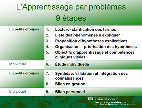 À la Faculté de la médecine et des sciences de la santé de l'Université de Sherbrooke, le programme de formation en apprentissage par problèmes est basé sur les neuf étapes suivantes :(https://www.usherbrooke.ca/doctorat-medecine/programme/phases-i-et-ii/apprentissage-par-problemes/)