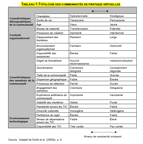 Dubé. L. (2004). Mieux comprendre le succès des communautés de pratique virtuelles par l’investigation des aspects technologiques - Projet Modes de travail et de collaboration à l’ère d’Internet. Récupéré du site du CEFRIO, section Publications, Transformation organisationnelle : http://www.cefrio.qc.ca/media/uploader/Mieux_comprendre.pdf