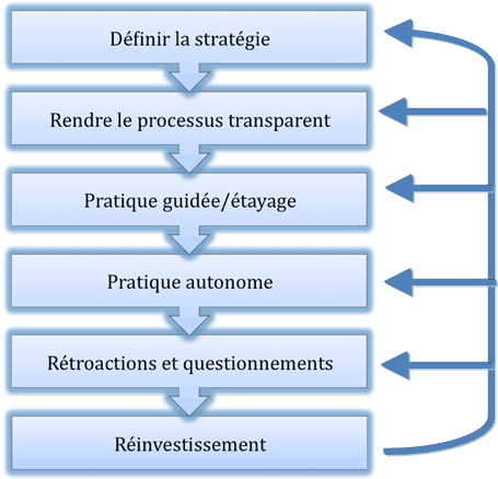 | 6. Réinvestissement | Maintenant que les élèves ont une connaissance plus approfondie de la stratégie, ils effectuent une ou des pratiques pour internaliser et automatiser ces apprentissages (Falardeau & Gagné, 2012). Une fois le travail effectué, l’enseignant doit démontrer à l’élève ce qu’il a appris afin que ce dernier réinvestissement ses apprentissages et que le transfert soit favorisé en vue d’autres pratiques. Pour l’enseignant, il est important de diversifier les contextes de pratique afin que l’utilisation de cette stratégie ne soit pas limitée à une seule tâche. |
