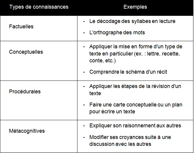 Exemples d'actions ou d'activités vécues pendant la lecture ou l'écriture coopérative en lien avec chaque type de connaissances en se basant sur la taxonomie de Bloom révisée par Anderson et al.
