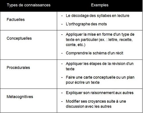 Le tableau 1 propose des exemples d'activités ou d'actions vécues par les apprenants qui travaillent en lecture-écriture coopérative pour chacun des types de connaissances classés selon la taxonomie de Bloom révisée.