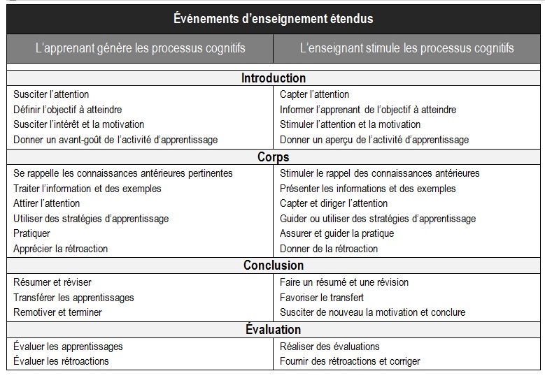 Selon l’approche cognitive de la conception pédagogique et plus particulièrement la perspective de la Conditions of Learning Theory, les activités d’enseignement-apprentissage de la stratégie des Neuf événements étendus visent à favoriser les huit conditions d'apprentissage : motiver les apprenants, activer les connaissances antérieures, présenter les connaissances, structurer les connaissances, pratiquer, centrer sur la tâche (les compétences), réguler et intégrer.