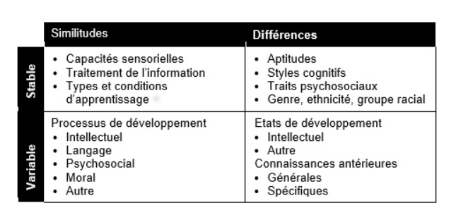 La figure suivante présentent les caractéristiques cognitives des apprenants, divisées en deux sous-groupes des caractéristiques qui peuvent demeurer stables ou varier avec le temps :