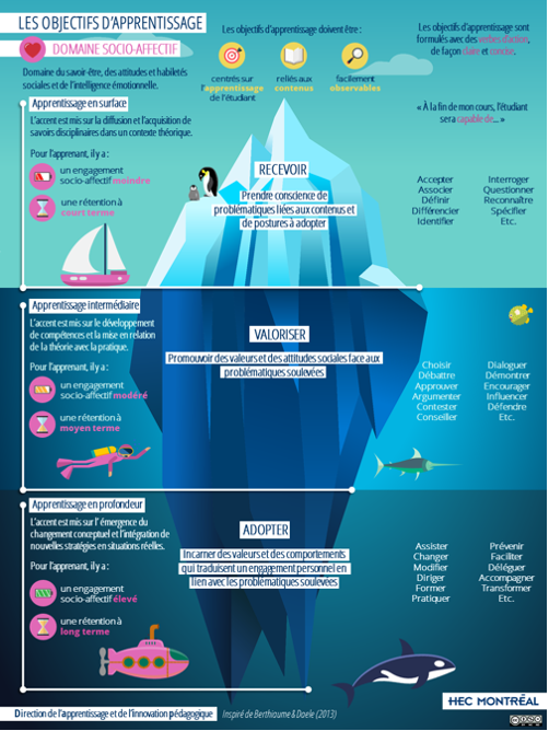 Les infographies suivantes, créées par HEC Montréal, représentent bien la vision des auteurs de ce que sont les objectifs d’apprentissage et comment ils doivent être au service des élèves.