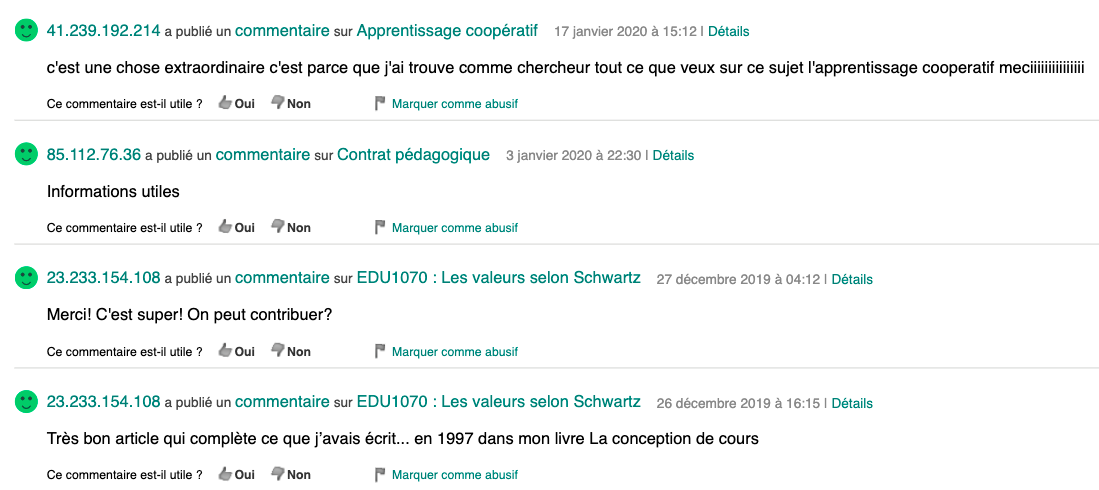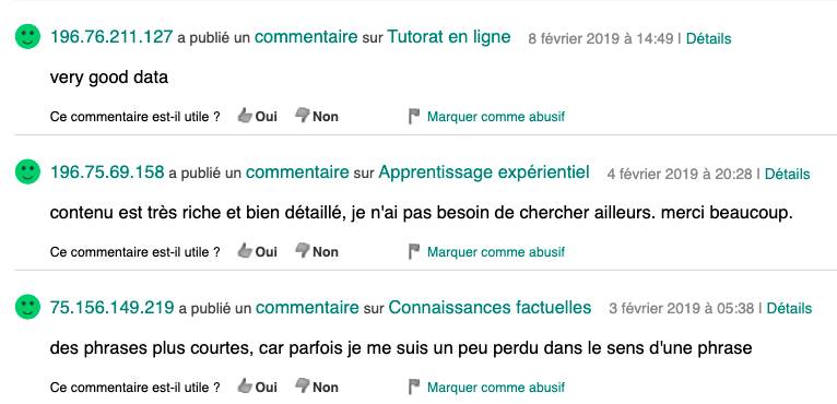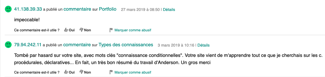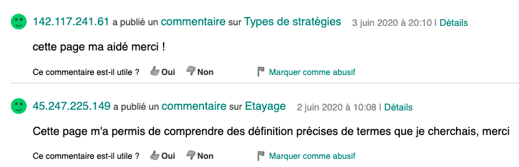 Témoignages des visiteurs externes formulés dans les Commentaires des pages