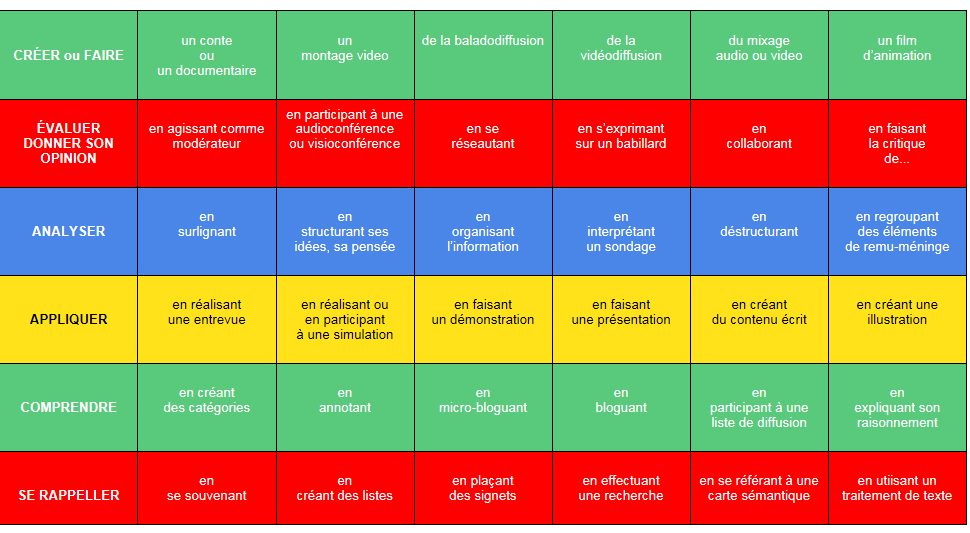 Cantin, J., Frigon, Nathalie. (2010). Taxonomie révisée de Bloom. Exemples de progression des processus cognitifs en intégrant les TIC. Repéré à : http://recit.org/bloom/Accueil
