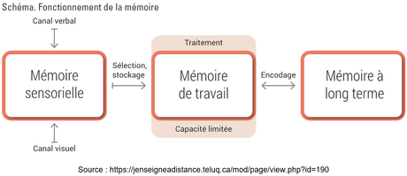 - la mémoire de travail a des capacités limitées en ce qui concerne le traitement des éléments d’information nouveaux. Ces limites génèrent le phénomène de la charge cognitive. Une charge cognitive trop importante peut nuire à l’apprentissage des connaissances nouvelles, soit leur encodage en mémoire à long terme;