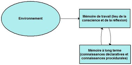 Dans cette perspective, l’apprentissage constitue un ensemble des processus qui permettent à un individu d’acquérir des connaissances qui viendront enrichir son système mémoriel dit mémoire à long terme. Ces connaissances acquises par un individu peuvent ou non s’exprimer dans son comportement autrement dit, elles sont récupérées et utilisées de façons diverses pour penser et d’agir dans le monde. En effet, si l’on considère souvent que la fonction de la mémoire à long terme est celle d’être la « gardienne du passé », les sciences cognitives ont mis en évidence une autre fonction de cette mémoire, tout aussi importante dans la vie de chaque humain. Les connaissances encodées dans la mémoire à long terme permettent continuellement de prévoir le futur », c’est-à-dire d’agir en anticipant continuellement (et de façon non consciente) l’interaction probable entre nous et le monde qui nous entoure, afin d’y agir de façon la plus optimale possible (de notre point de vue). Autrement dit, nos actions dans le monde utilisent principalement sur les connaissances encodées en mémoire à long terme et activées dans le système mémoriel appelé mémoire de travail, une sorte de "fenêtre de la conscience" qui contient à quoi nous portons attention, ce qui est présent à l’esprit (Chanquoy, Tricot et Sweller, 2007).